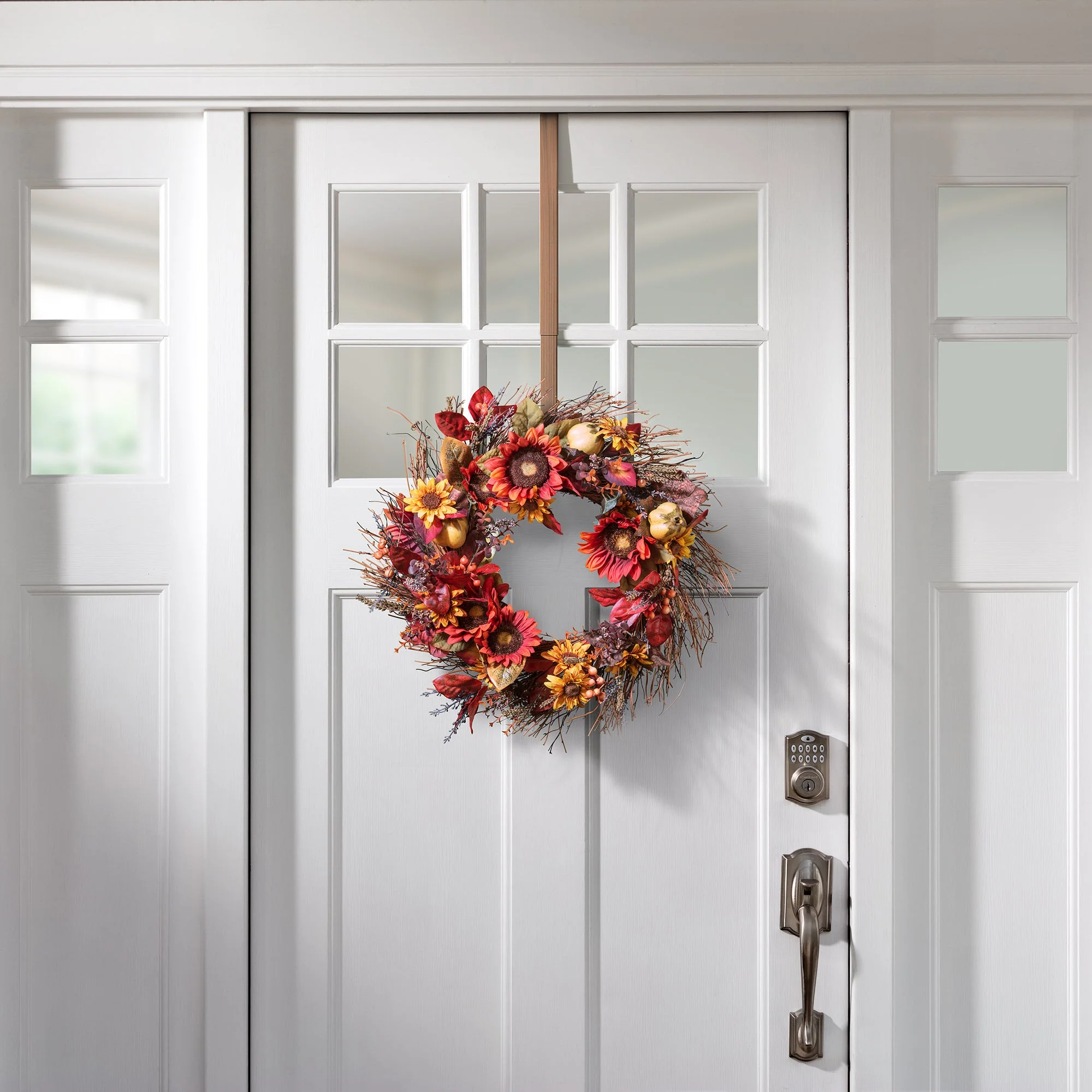 - Special pads on the back protect your door from scratches. Plus, our adjustable wreath holder comes in a variety of finishes to match your mood and style.