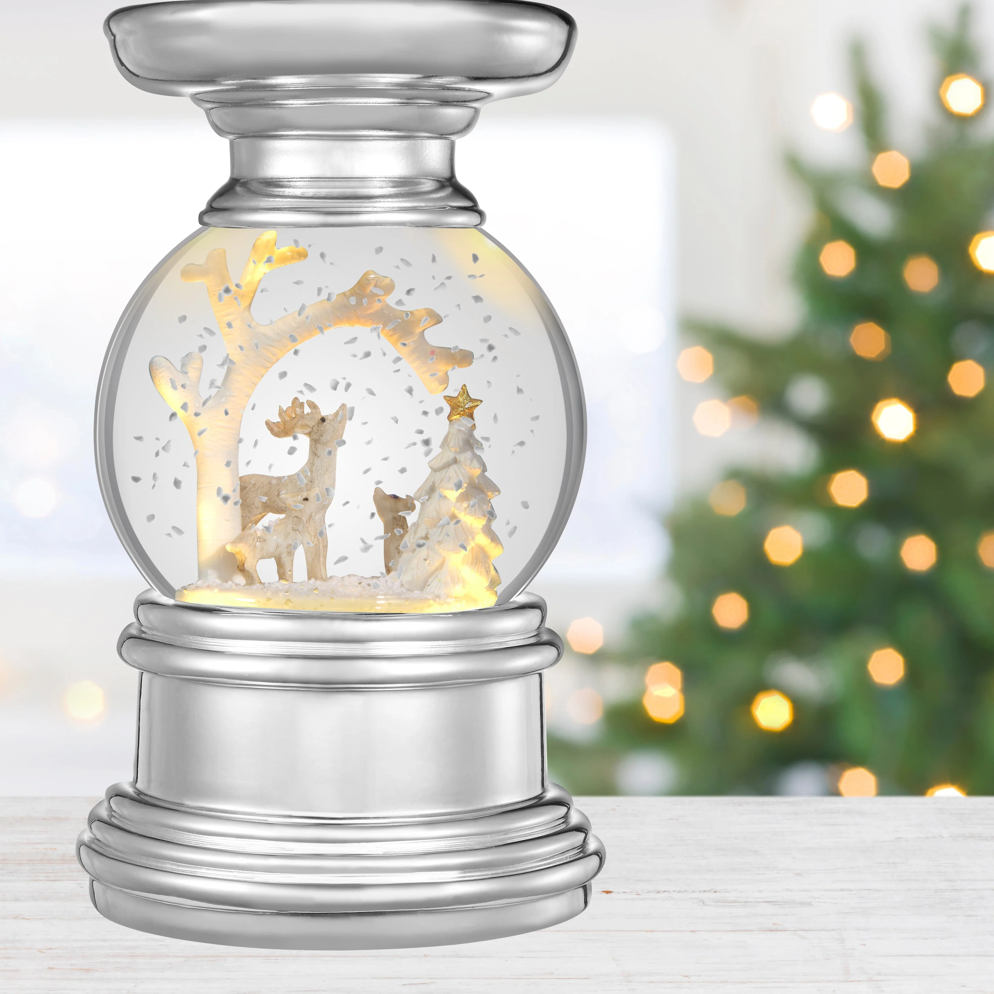 - FESTIVE- Features reindeer with a snowy winter Christmas scene inside the globe with a polished silver finish candle holder and base.