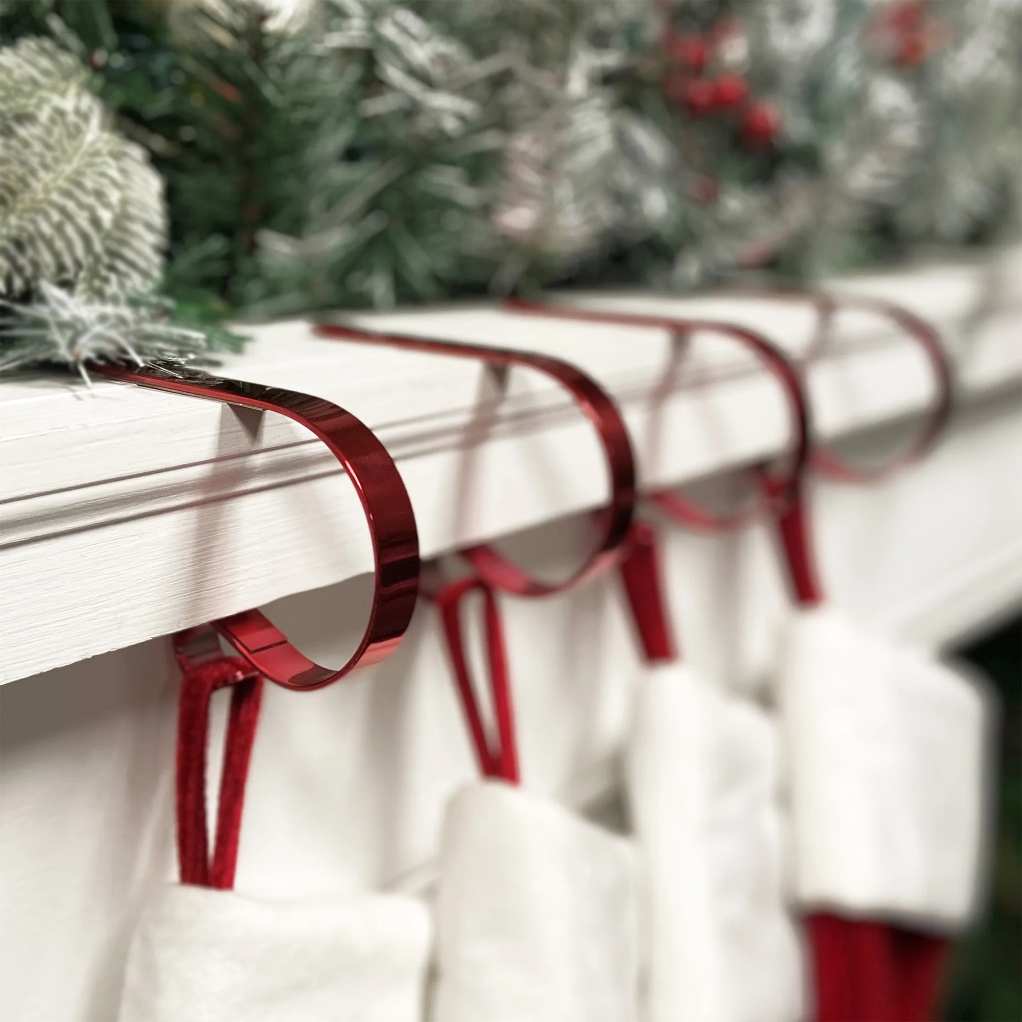 *Free Shipping* The Original MantleClip stocking holder features a sophisticated low-profile design that will not interfere with other Christmas decor displayed on the mantel, such as Christmas villages or garlands. What's more, these stocking holders are a good choice for households with pets and small children. Ordinary stocking holders often consist of very heavy weights that can fall on curious children or pets. These amazing MantleClip stocking holders are the answer! Weighing only a few ounces each, these durable clips hold stockings in place safely and securely. With their sturdy metal construction, they support even the fullest stockings (up to 10lbs). Clear soft gripper pads hold the clips in place while protecting the mantel surface from scratches. Use these versatile MantleClips to display Christmas stockings, holiday ornaments, and colorful garlands.
